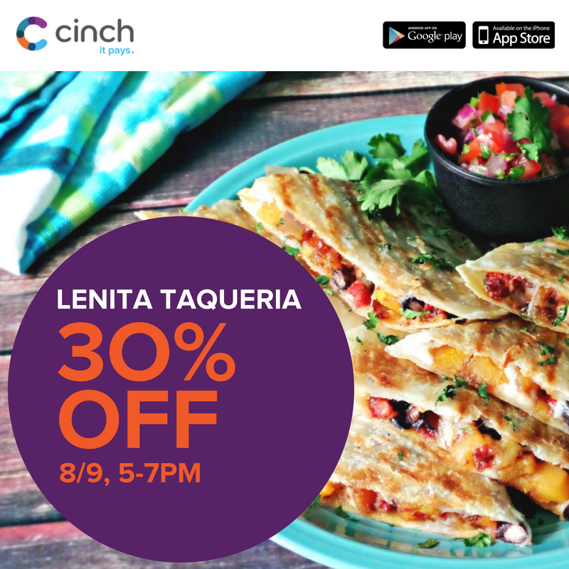 Join us at Lenita Taqueria for Happy Hour with 30% off using Cinch! Just download the Cinch app and enter the promo code FIDI for a one-time discount of 50% (Maximum discount is $25, for new users only!). This code provides discount on top of the 30% provided during the event. Returning Cinch customers will still enjoy the 30% off!
